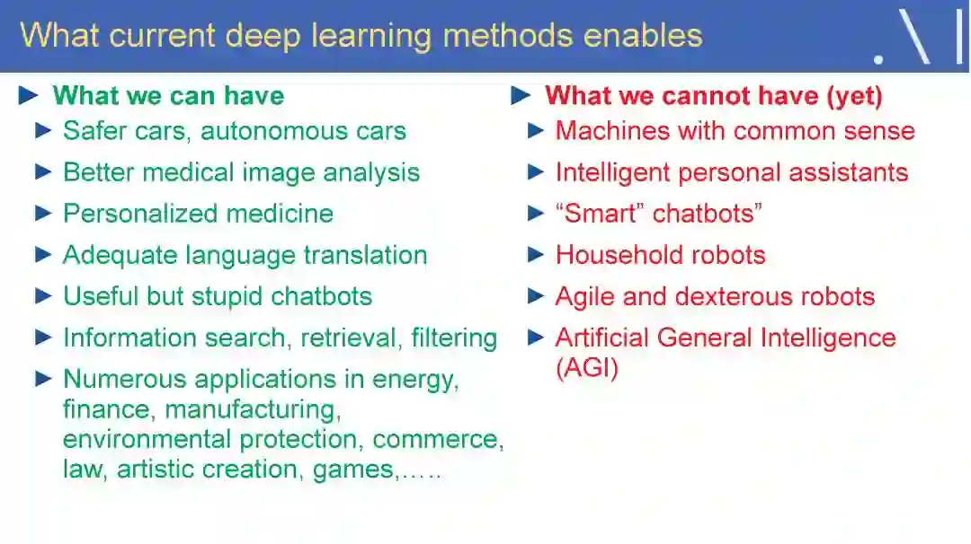 LeCun 表示人工智能革命的未来不会是有监督学习,也不会是单纯的强化学习,而是需要学习一个具备常识推理与预测能力的世界模型。LeCun 认为自监督学习是实现这一目标的一个潜在研究方向。他认可现有的有监督学习和强化学习技术可以使人类在自动驾驶、医疗诊断、机器翻译、客服机器人、信息检索等领域中取得不错的进展,但他认为仅仅依靠现有技术,无法实现常识推理、智能个人助理、智能聊天机器人、家庭机器人以及通用人工智能。