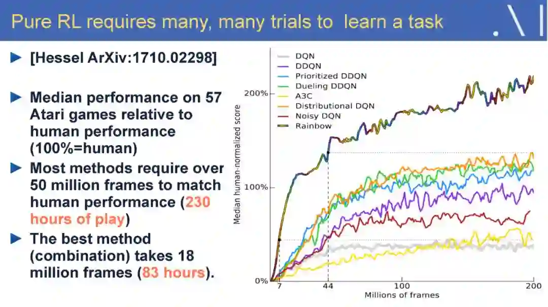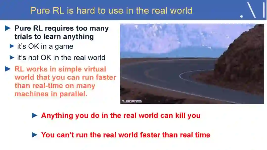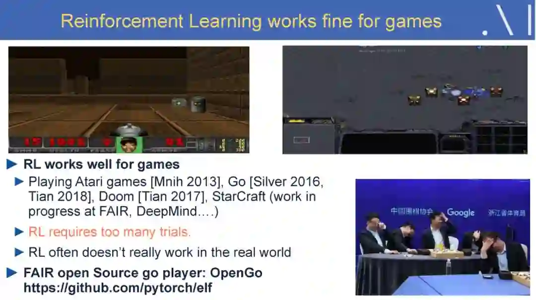Yan Lecun在报告中指出自监督学习(Self-supervised learning)可以作为强化学习的一种潜在解决方案,因为自监督学习将输入和输出都当成完整系统的一部分,使得它在诸如图像补全,图像迁移,时间序列预测等任务上都非常有效。此外自监督模型的复杂度随着额外反馈信息的加入而增加,可以在很大程度上减少计算过程中人为的干预。
