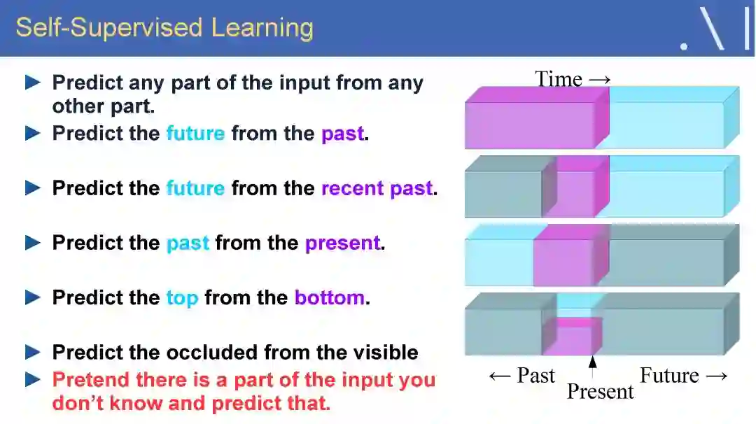 在这样的背景下,LeCun 认为自监督学习是有望突破有监督学习与强化学习现状、学习世界模型的一个潜在研究方向。自监督学习将输入和输出当成一个完整的整体,它通过挖掘输入数据本身提供的弱标注信息,基于输入数据的某些部分预测其它部分。在达到预测目标的过程中,模型可以学习到数据本身的语义特征表示,这些特征表示可以进一步被用于其他任务当中。当前自监督学习的发展主要体现在视频、图像处理领域。例如,在空间层面上包括图像补全、图像语义分割、灰度图像着色等,在时间层面上包括视频帧预测、自动驾驶等。