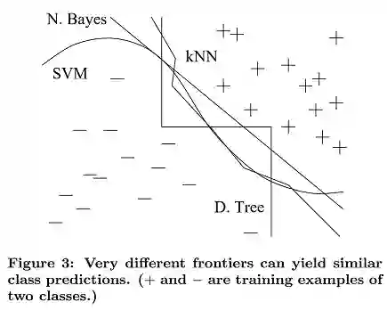 更聪明的算法并不能得到更好的结果的部分原因是,它们最终都在做同样的事情 -- 所有的学习器基本上都是通过将附近的样本分组到同一个类中来工作的,关键的区别在于“附近”的含义。当数据的分布不均匀时,即使比较复杂的学习器也可以产生差别很大的分类结果边界,他们最终仍然会 在重要区域(具有大量训练样本的区域,也可能是大多数测试样本出现的地方)做出相同的预测。如下图所示,无论是一条奇特的曲线、一条直线还是一个阶梯边界,最终都可以得到相同的预测: