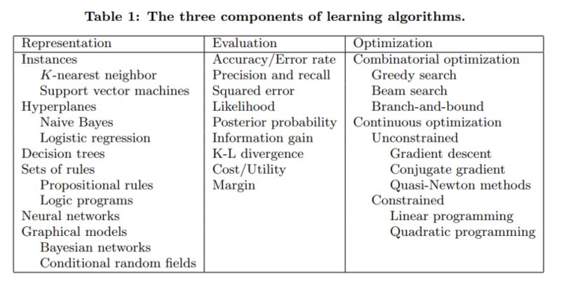在这个巨大的空间中不迷路的关键,是要理解所有学习算法都包含三个核心要素: