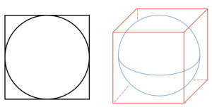 注意:你可能已经被所有这些“超(hyper)”给弄糊涂了,超立方内部的超球面在二维和三维空间中看起来会像下面这样: