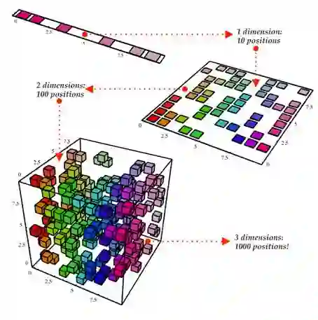 紧随过拟合之后,机器学习中最大的问题是 维数的诅咒。这意味着如果输入是高维的,许多在低维度下正常工作的算法会变得难以处理。由于固定大小的训练集只覆盖了输入空间的一小部分(可能的组合变得巨大),因此随着样本 维度(即特征的数量) 的增长,正确泛化的难度呈指数增加。但这就是机器学习既有必要又有困难的原因。如下图所示,即使从 1-D 过渡到 3-D,分辨出不同样本的工作似乎开始变得越来越难——在高维度上,所有的样本看起来都是一样的。