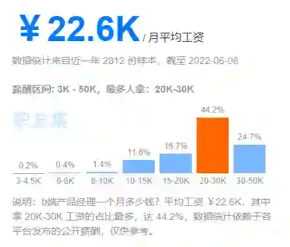 ● 从薪资水平来看:根据职友集数据显示,B端产品经理月平均工资22.6k,44.2%的能拿到20-30k的区间,16.7%也能拿到15-20k的薪资。