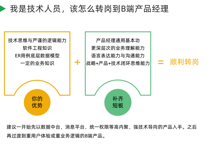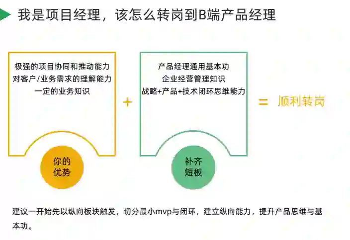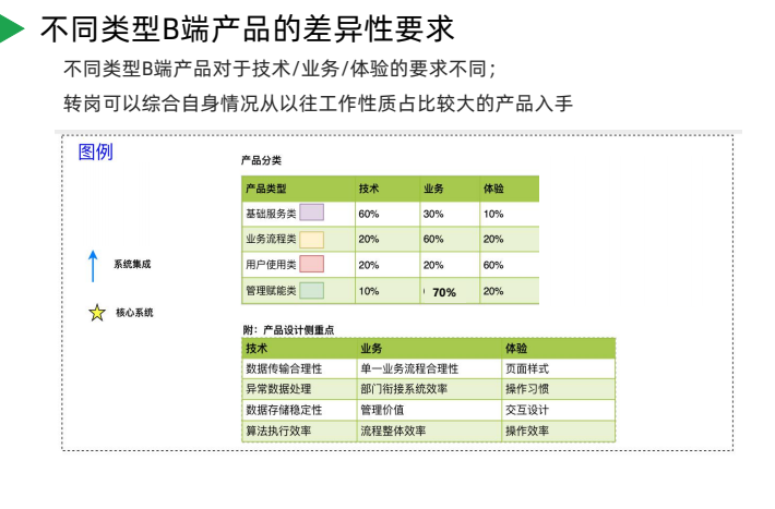 最后可以针对不同类型B端产品对于技术/业务/体验的不同要求,综合自身情况从以往工作性质占比较大的岗位类型入手,减小转岗难度。