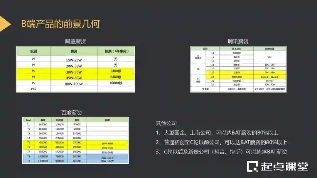 过硬的综合能力也意味着,能够拥有更广阔的职业发展空间。以阿里为例,从p6(产品专家)→p7(业务专家)→p8(咨询顾问)到p9(产品总监),薪资更是翻了5倍。