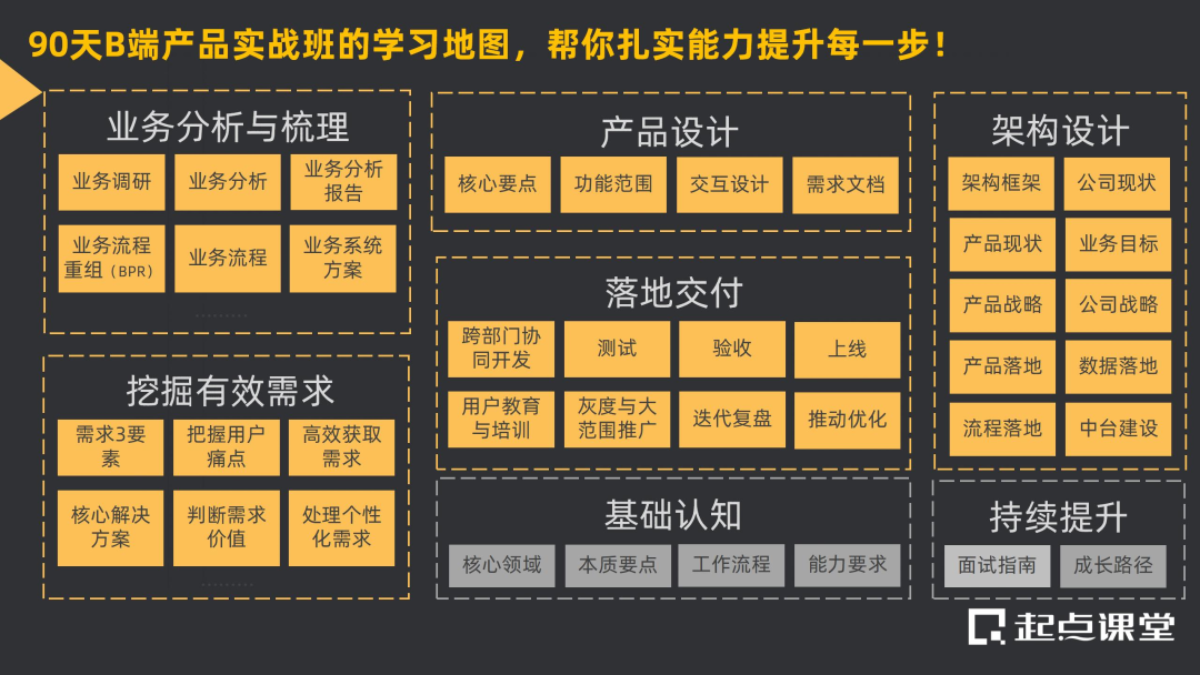 由腾讯课堂&起点课堂联合打造《90天B端产品经理实战班》,以B端产品经理完整的工作流程为主线结构。