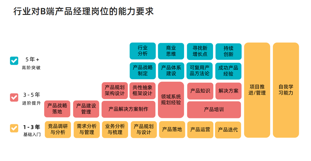 拆解并总结大厂对B端产品经理的能力要求,可以看出市场对于不同阶段的产品经理有着不同的要求,对初级B端产品经理要求具备最基本的落地能力、项目推进能力,包括“竞品调研与分析-需求分析与管理-业务分析与梳理-产品规划与设计-产品落地-产品运营-产品迭代”。