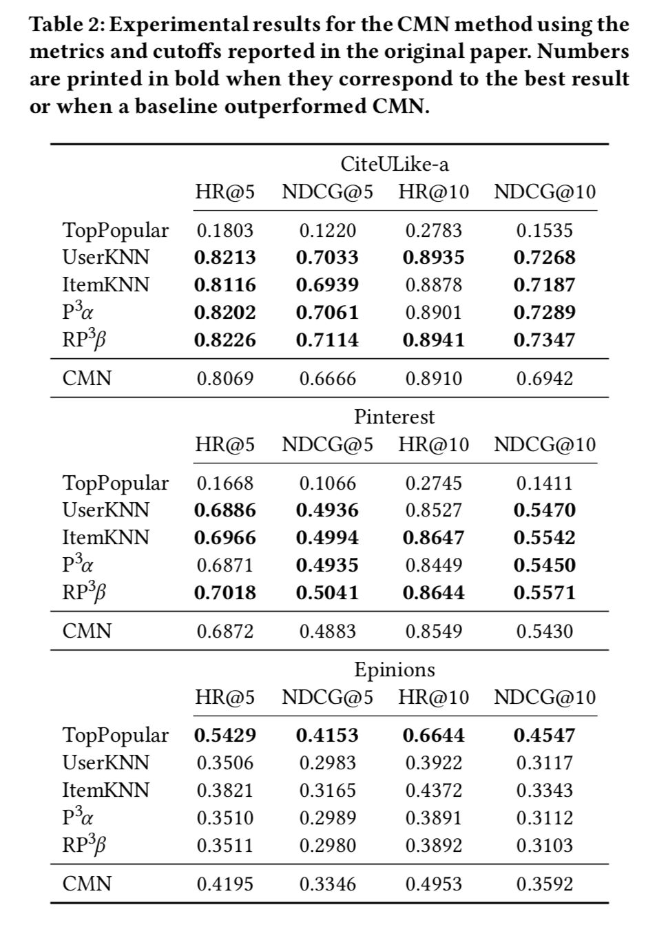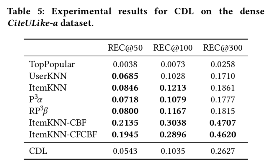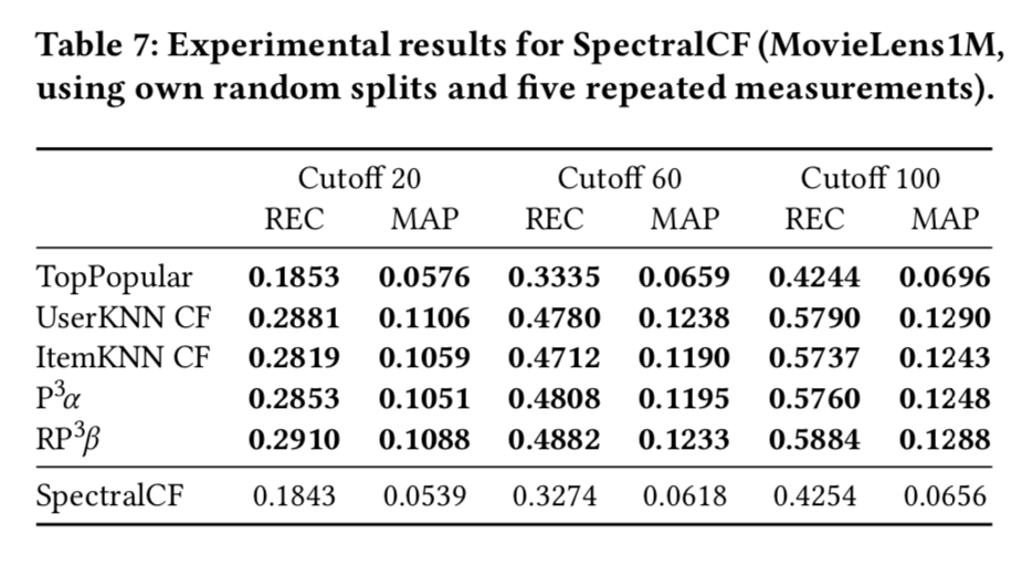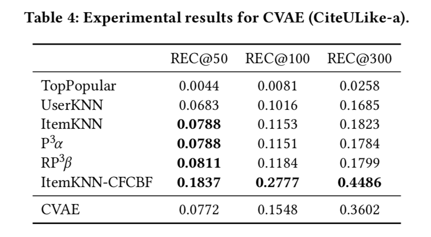 通过将可复现的 7 个方法与基准方法在相同数据集上进行测试,可以评估这些可复现方法的真实性能。这里主要评估之前挑选的7中可复现方法,其中只有Collaborative Variational Autoencoder(CVAE)能在同等训练条件下超越传统方法,其他算法都不如同等测试条件下的传统方法。