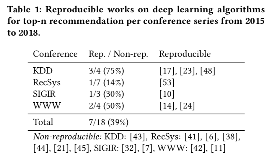 本文主要关注近年来发表在热门会议上的基于深度学习的 top-n 推荐算法,聚焦于它们的可复现性和真实性能。结果表明大部分算法都无法重现理想结果,甚至无法超越传统的启发式算法,这说明推荐算法领域的研究和审核需要更加严谨和仔细,算法的性能评估需要更加标准,正确的方法。文中提到的那些无法复现和效果低于预期的工作肯定会被重新审核,甚至退回。