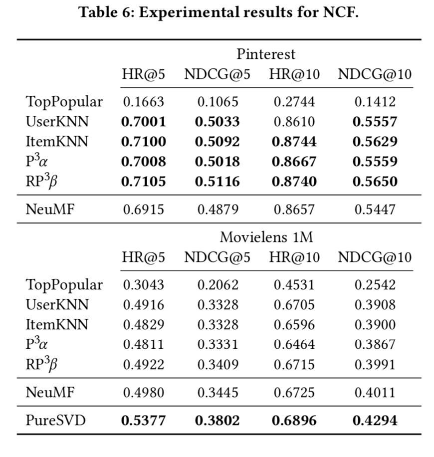 在此标准的基础上,作者评估了近几年发表在顶尖会议上,运用深度学习方法来实现 top-n 推荐的 18 篇工作,最后发现:只有七篇工作是可复现的;而这 7 篇工作中,有 6 篇都没能超越传统的、经过合理调参的启发式方法。即使是简单地将最流行的items推荐给每个用户(TopPopular),也能在特定的性能指标衡量下超越深度学习方法达到最优。