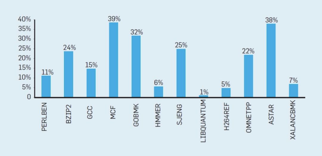 为了理解这些浪费的工作是如何累加起来的,请考虑下图中的数据,其中显示了有效执行但由于处理器的错误推测而被浪费的指令的部分。在Intel Core i7上,这些基准测试平均浪费了19%的指令。