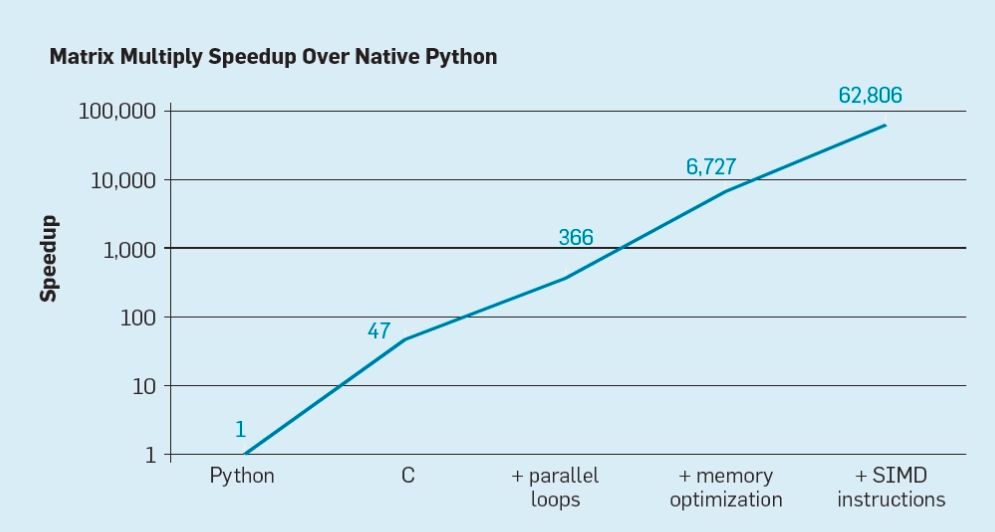 有两个很清楚的机会,以及将两者结合起来所创造出的第三个机会。首先,现有的软件构建技术广泛使用具有动态类型和存储管理的高级语言。不幸的是,这些语言的可解释性和执行效率往往非常低。Leiserson等人用矩阵乘法运算为例来说明这种低效率。如图7所示,简单地用动态高级语言Python重写C语言代码,将性能提高了47倍。使用多核并行循环处理将性能提升了大约7倍。优化内存布局提高缓存利用率,将性能提升了20倍,最后,使用硬件扩展来执行单指令多数据(SIMD)并行操作每条指令能够执行16个32位操作,让性能提高了9倍。总而言之,与原始Python版本相比,最终的高度优化版在多核英特尔处理器上的运行速度提高了62,000倍。这当然只是一个小的例子,程序员应该使用优化后的代码库。虽然它夸大了通常的性能差距,但有许多软件都可以实现这样性能100倍到1000倍的提升。