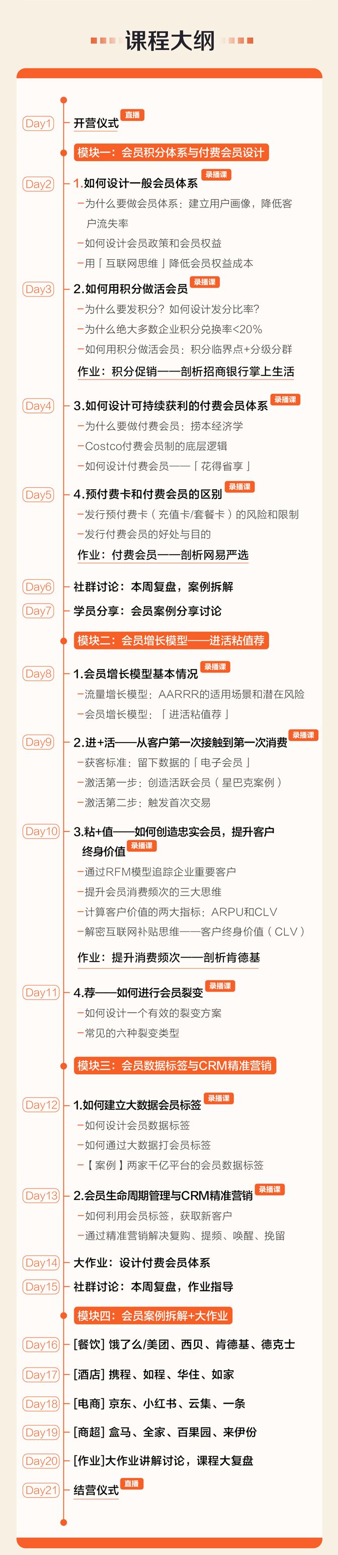 本次训练营将提供给你一套完整会员增长体系,无论你是市场、运营、CRM等部门负责人还是电商、餐饮、商超便利、服装、酒店、母婴、生鲜、食品、美发等零售行业,都能帮助你学会: