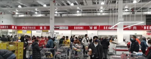 2月10日上海企业复工,在2月21日,上海Costco门店已经被前来购物的市民挤得水泄不通。当天高峰时期,超市店内电子显示屏显示,该时段同时有1900多人在此购物。照片发到网上后,在政府部门要求下,开始限流1000人的措施。