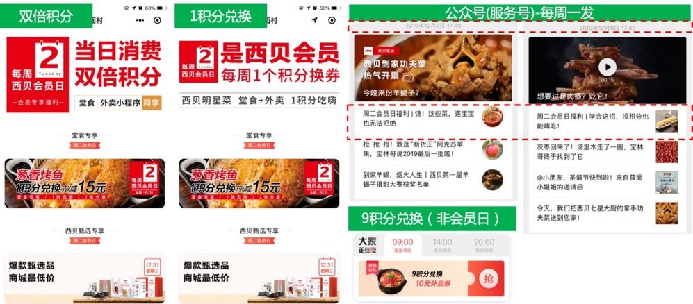 同时西贝设置了「消费20元返1积分」,获得的积分可以兑换商品或特权,有意思的每周二是西贝会员日,在这一天消费可以享受双倍积分,同时可以参加1积分兑换特价菜品,扩大了积分的使用率,配合公众号每周一推送第二天活动信息,非常有效地提升了会员复购率。