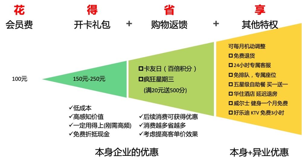 得:是指客户免费获得什么。这是无条件的赠与,一般称为开卡礼包,建议大概是会员年费的1.5-2.5倍。