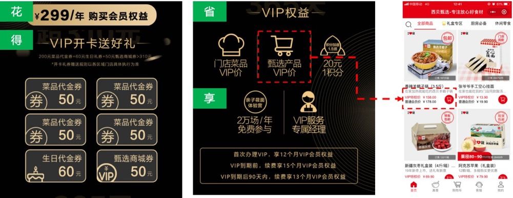 得:4张菜品代金券+1张生日代金券+1张甄选商城券(跟电商平台关联),总价值是310元,略高于会员年费。四张菜品代金券需要消费四次,可以有效地培养会员对西贝的忠诚度,同时甄选商城券可以给电商平台导流,提升客户在家里购买西贝产品的可能性。