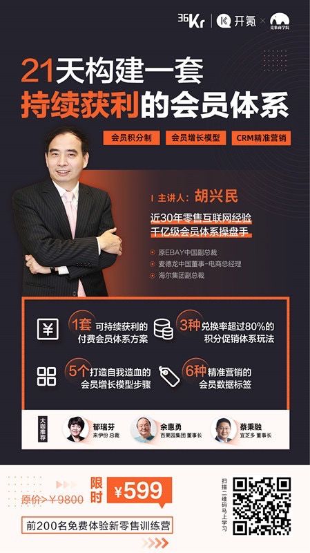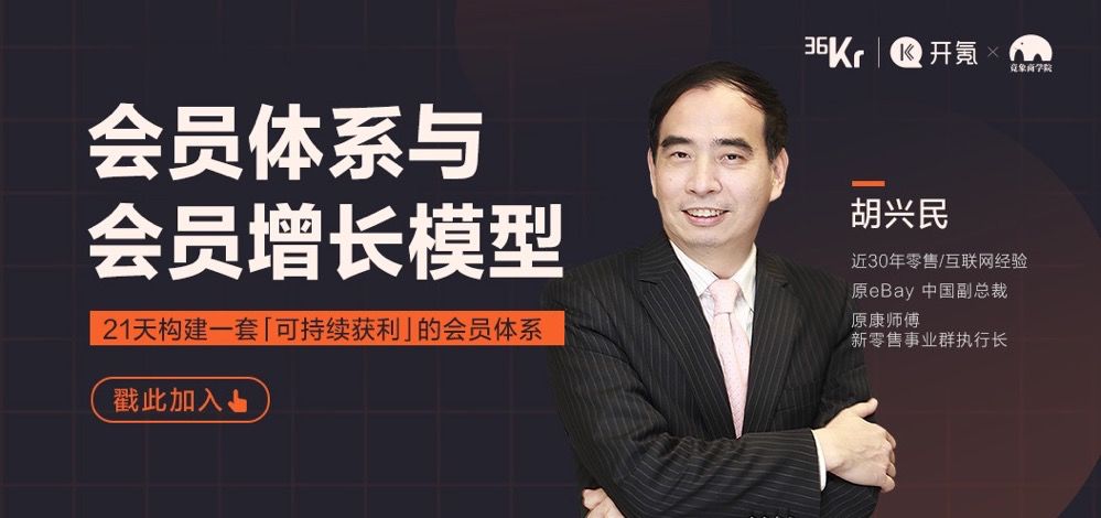 在这里,强烈推荐一门课程给大家:36氪与原eBay中国副总裁、麦德龙中国董事电商总经理、海尔集团副总裁,30年互联网零售行业经验的胡兴民老师一同打造的《21天会员增长实操训练营》。