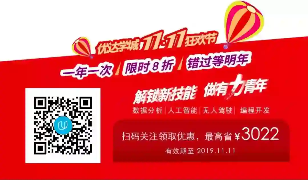 之前推荐过的的优达学城(Udacity),最近双十一也有活动了,全场纳米学位 8 折,我觉得这是对职场非常有积累的事情,而且还能控制成本。