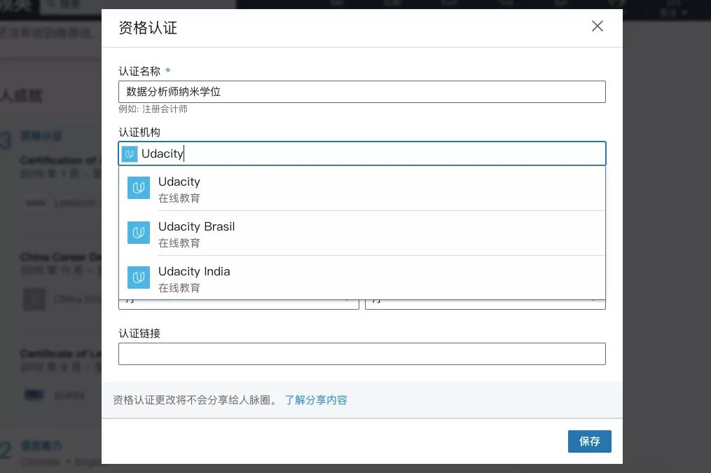 Udacity 是由 Google 无人车之父、同时也是 Google X 实验室创始人的 Sebastian Thrun 创立的学习平台,专注数据科学、人工智能、无人驾驶等领域。Udacity 联合 Amazon、Githab、Github 等硅谷企业推出了“纳米学位”,毕业后的证书可以直接添加进 LinkedIn 个人简历: