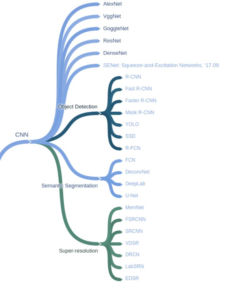 如下所示,CNN 除了包含执行目标识别任务的 AlexNet 等深度卷积网络,还包括很多优秀的模型用于处理目标检测、语义分割和超分辨率等任务。它们以不同的方式应用卷积过程处理不同的任务,并在这些任务上产生了非常好的效果。从基本上来说,卷积相对于最初的全连接网络有很多优秀的属性,例如它只和上一层神经元产生部分的连接,同一个卷积核可以在输入张量上重复使用,也就是说特征检测器可以在输入图像上重复检测是否有该局部特征。这是卷积网络十分优秀的属性,它大大减少了两层间参数的数量。