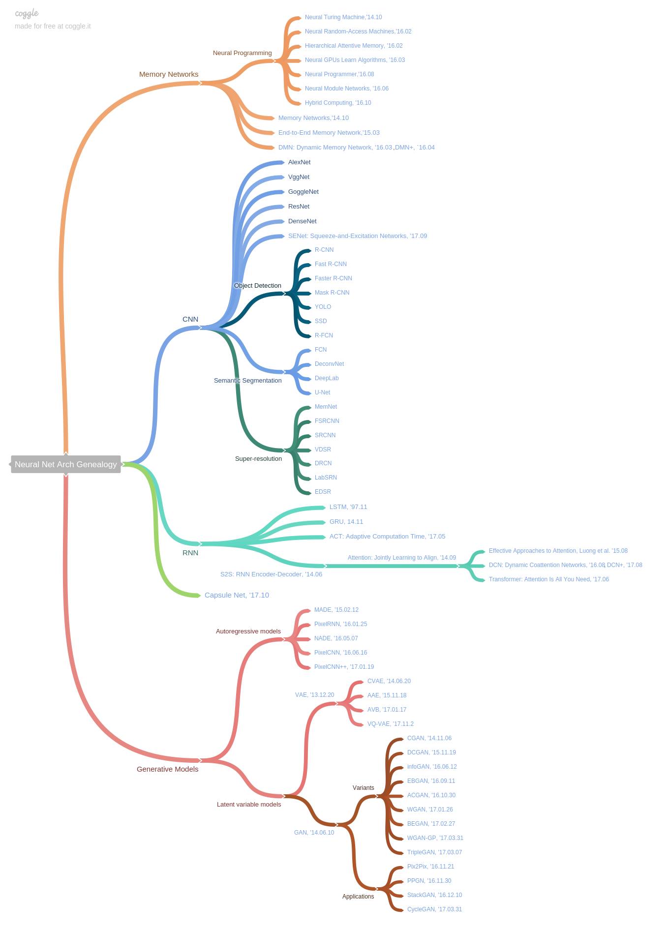 近几年,深度学习高速发展,出现了大量的新模型与架构,以至于我们无法理清网络类型之间的关系。在这篇文章中,香港科技大学(HKUST)助理教授金成勳总结了深度网络类型之间的谱系图,以便于我们索引不同类型网络的杰出研究成果。