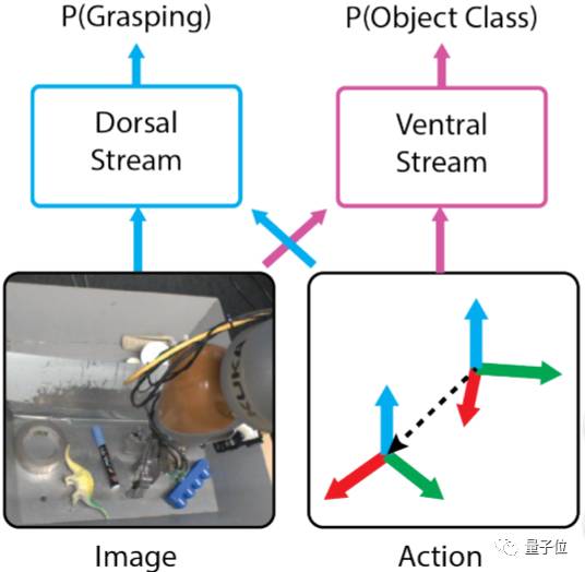 在这个模型中,腹流负责识别物体类别,背流同时解释正确抓取所需的几何图形关系。测试人员利用机器人自主数据采集能力获取了大量自监督数据集来训练背流,并用半监督学习中的标签传播算法训练腹流,同时佐以适当的人力监督。