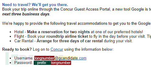 在查阅了我之前收到的电子邮件后,我怀疑Google招聘人员使用了“某个固定前缀(fixed_prefix)+数字”的默认密码方式来创建帐户。默认密码本质上算是无用的,在应聘者未更改默认密码的前提下,登录应聘者Concur页面所需的唯一信息,就是他们的帐号。就连我自己在预订面试航班的前一天,也没修改过其默认密码。我只偶尔记得帐号信息,然而大多数时候,好多人会忘记Google分配给自己的密码,而且会把其密码重置方式和注册登录Concur的普通账户方式混淆。对此,我想这种情况下,Google的这种Concur系统应用方式存在默认密码漏洞,可被暴力攻击(虽然利用难度较大)。
