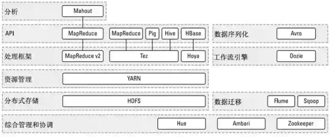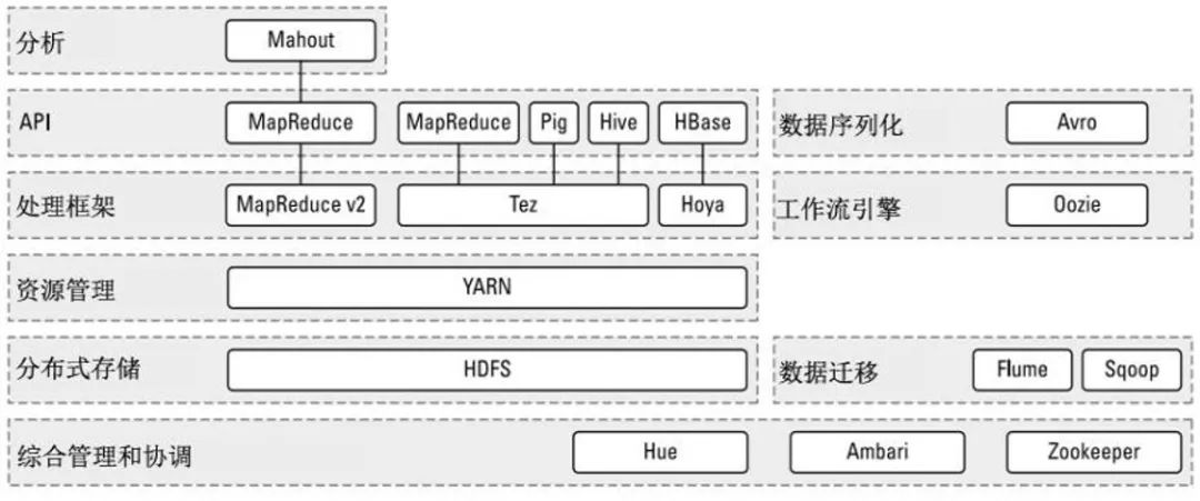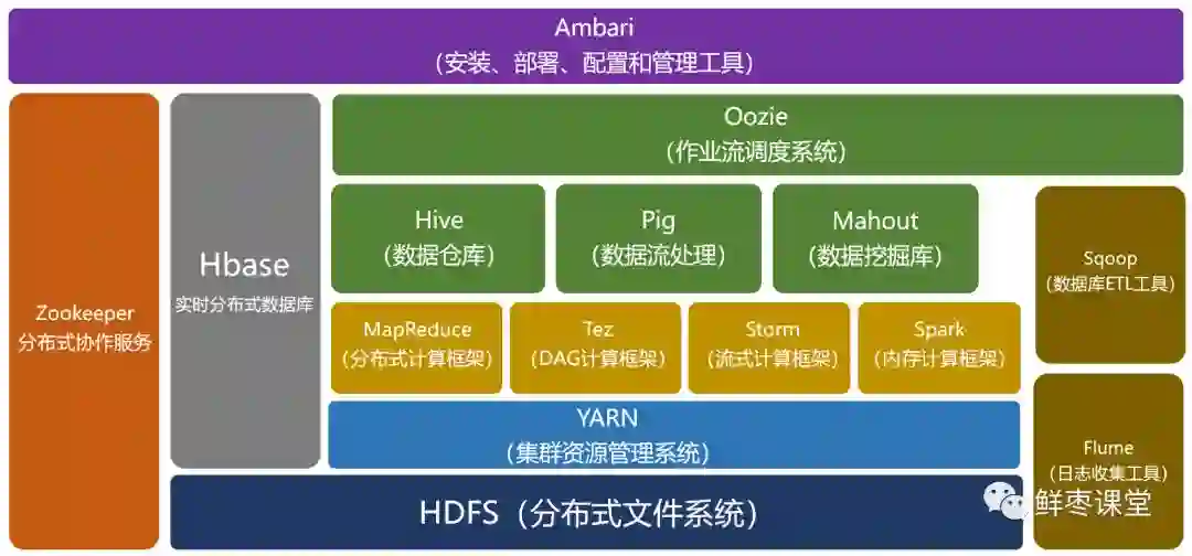 经过时间的累积,Hadoop已经从最开始的两三个组件,发展成一个拥有20多个部件的生态系统。