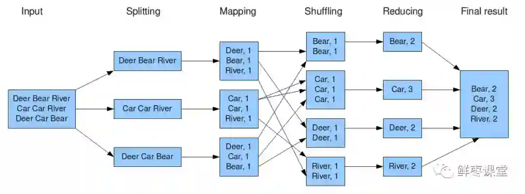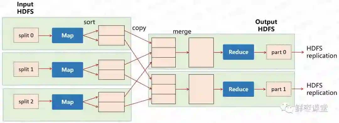 当你向MapReduce框架提交一个计算作业时,它会首先把计算作业拆分成若干个Map任务,然后分配到不同的节点上去执行,每一个Map任务处理输入数据中的一部分,当Map任务完成后,它会生成一些中间文件,这些中间文件将会作为Reduce任务的输入数据。Reduce任务的主要目标就是把前面若干个Map的输出汇总到一起并输出。