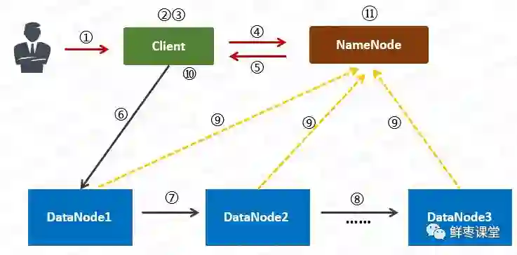 8 第二个DataNode将数据复制给第三个DataNode。