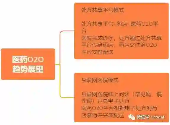 当然,诊疗活动的起点也可以在线上:患者通过互联网医院在线上完成诊疗并开具处方(慢病、常见病),处方传给O2O平台,O2O平台自营或者在合作的药店取得药品并配送到家。