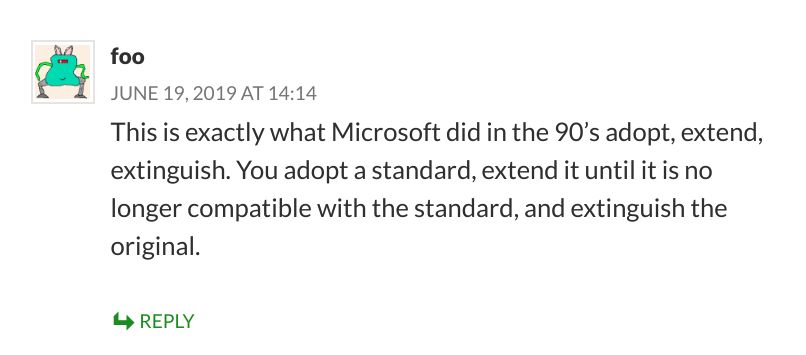 有意思的是,Daniel 的这篇博客评论中有人将谷歌的这一动作与微软 90 年代的“拥抱、扩展再毁灭”策略联系了起来。