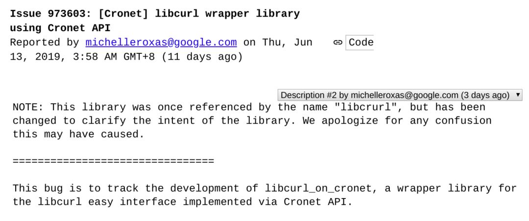 Chromium bug 团队近日表示他们将基于 Chromium 网络栈 Cronet 实现一个名为 libcrurl 的库,用来提供部分 libcurl API。对于 Daniel 来说,谷歌很可能是要实现一个他们自己的 curl,所以后边可能出现一个基于 libcrurl 的“crurl”。