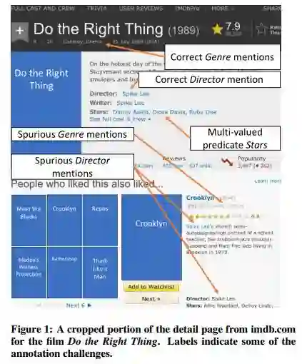 摘要:The web contains countless semi-structured websites, which can be a rich source of information for populating knowledge bases. Existing methods for extracting relations from the DOM trees of semi-structured webpages can achieve high precision and recall only when manual annotations for each website are available. Although there have been efforts to learn extractors from automatically-generated labels, these methods are not sufficiently robust to succeed in settings with complex schemas and information-rich websites. In this paper we present a new method for automatic extraction from semi-structured websites based on distant supervision. We automatically generate training labels by aligning an existing knowledge base with a web page and leveraging the unique structural characteristics of semi-structured websites. We then train a classifier based on the potentially noisy and incomplete labels to predict new relation instances. Our method can compete with annotation-based techniques in the literature in terms of extraction quality. A large-scale experiment on over 400,000 pages from dozens of multi-lingual long-tail websites harvested 1.25 million facts at a precision of 90%.