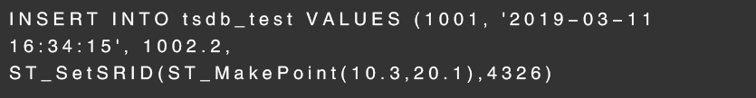 用户也可以通过psql交互式终端向时空数据库写入数据,下面是几个简单的例子:
