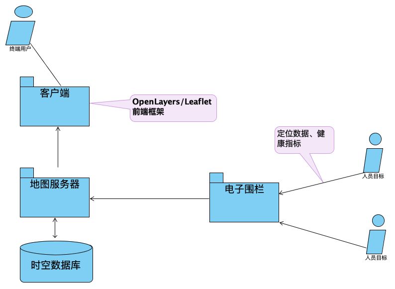 时空数据库存储时空和指标数据,并提供空间查询功能,提供后端支持。GeoServer作为地图服务引擎用于空间数据渲染和地图发布,前端客户端采用Leaflet或openlayers框架。电子围栏服务用于判断移动目标同电子围栏的空间关系,并触发告警信息。
