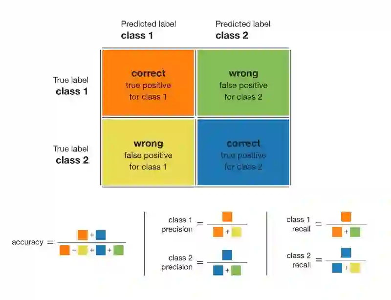 让我们简单解释一下:所谓准确率(accuracy)就是正确预测的数量除以预测总数;类别精度(precision)表示当模型判断一个点属于该类的情况下,判断结果的可信程度。类别召回率(recall)表示模型能够检测到该类的比率。类别的 F1 分数是精度和召回率的调和平均值(F1 = 2×precision×recall / (precision + recall)),F1 能够将一个类的精度和召回率结合在同一个指标当中。