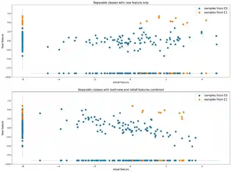 除了重采样外,我们还可以在数据集中添加一个或多个其他特征,使数据集更加丰富,这样我们可能获得更好的准确率结果。回到刚才的例子(两个类无法很好地分离开来),我们附加一个新的特征帮助分离两个类,如下图所示: