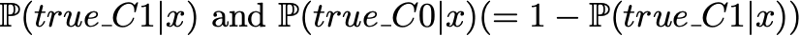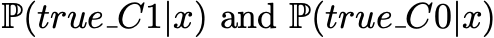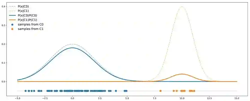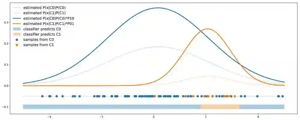 在这个例子中,我们可以看到 C0 的曲线总是在 C1 曲线之上,因此对于任意给定点,它出自 C0 类的概率总是大于出自 C1 类的概率。用贝叶斯公式来表示,即: