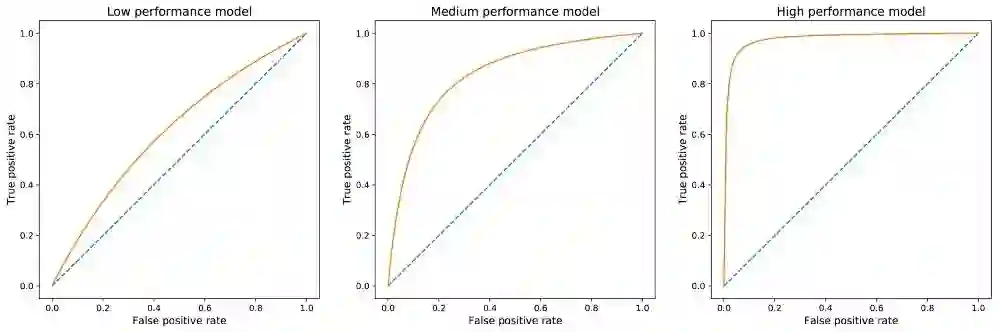 基于 ROC 曲线,我们可以构建另一个更容易使用的指标来评估模型:AUROC(Area Under the ROC),即 ROC 曲线下面积。可以看出,AUROC 在最佳情况下将趋近于 1.0,而在最坏情况下降趋向于 0.5。同样,一个好的 AUROC 分数意味着我们评估的模型并没有为获得某个类(通常是少数类)的高召回率而牺牲很多精度。
