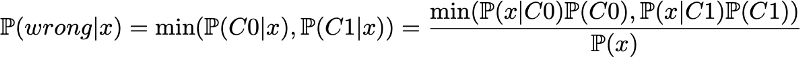 我们可以用公式的形式来表示。实际上,从理论的角度来看,最好的分类器将从两个类中选择点 x 最有可能属于的类。这自然就意味着对于给定的点 x,最好的理论误差概率由这两个类可能性较小的一个给出,即