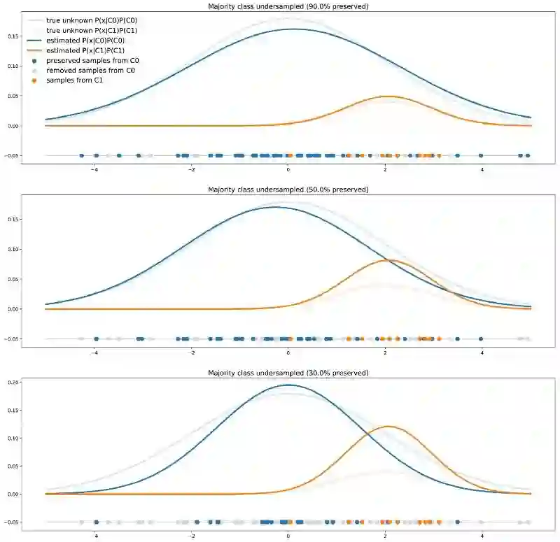 当使用重采样方法(例如从 C0 获得的数据多于从 C1 获得的数据)时,我们在训练过程向分类器显示了两个类的错误比例。以这种方式学得的分类器在未来实际测试数据上得到的准确率甚至比在未改变数据集上训练的分类器准确率还低。实际上,类的真实比例对于分类新的点非常重要,而这一信息在重新采样数据集时被丢失了。