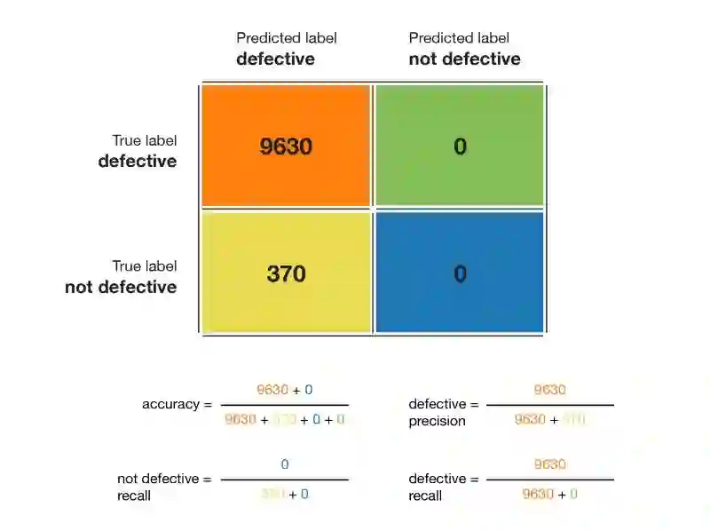 根据上图,准确率为 96.2%,无缺陷类的精度为 96.2%,有缺陷类的精度不可计算;无缺陷类的召回率为 1.0(这很好,所有无缺陷的产品都会被检测出来),有缺陷类的召回率是 0(这很糟糕,没有检测到有缺陷的产品)。因此我们可以得出结论,这个模型对有缺陷类是不友好的。有缺陷产品的 F1 分数不可计算,无缺陷产品的 F1 分数是 0.981。在这个例子中,如果我们查看了混淆矩阵,就会重新考虑我们的模型或目标,也就不会有前面的那种无用模型了。