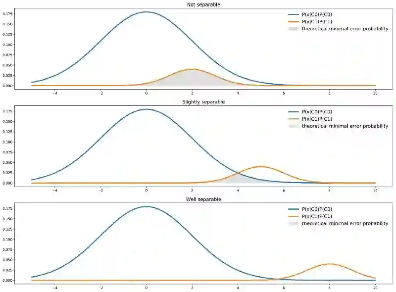 在这里我们看到,与前一种情况相反,C0 曲线并不总是高于 C1 曲线,因此有些点出自 C1 类的概率就会高于出自 C0 的概率。在这种情况下,两个类分离得足够开,足以补偿不平衡,分类器不一定总是得到 C0 的结果。