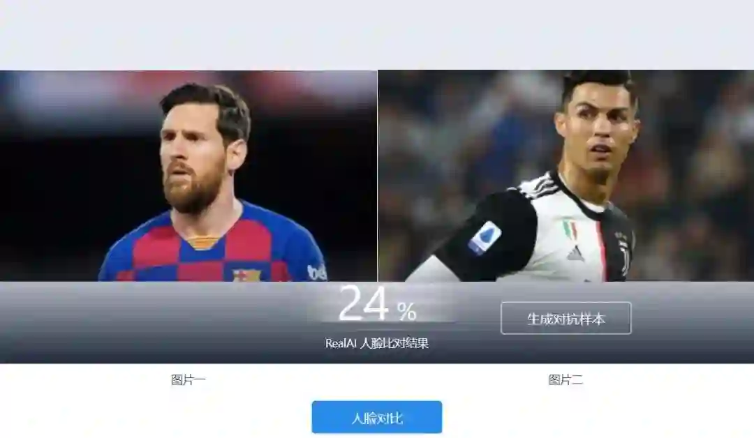 点击「生成对抗样本」按钮,经过十秒的处理时间,模型就为我们生成了一个基于 C 罗照片的「梅西」对抗样本照片: