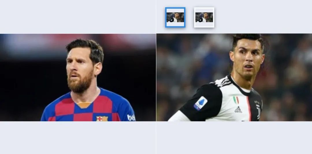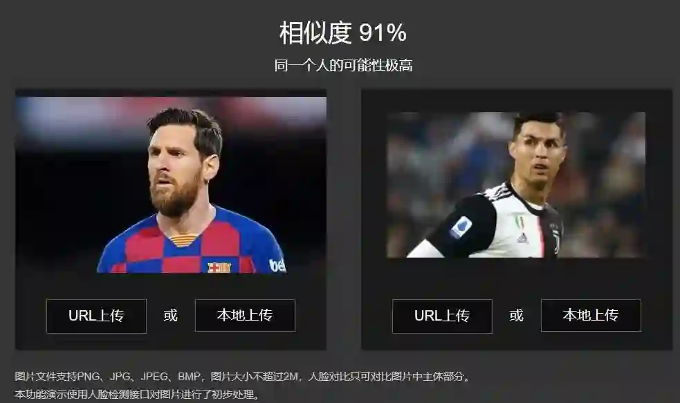 在其他公司的人脸相似度对比模型上,AI 把 C 罗的照片错认为是梅西:「同一个人的可能性极高」。我们尝试了上传梅西的不同照片,相似度应该是 95% 左右。而如果用 C 罗未处理过的照片,或者贝尔的照片,相似度则只有 75% 左右,并显示「同一个人的可能性较低」。