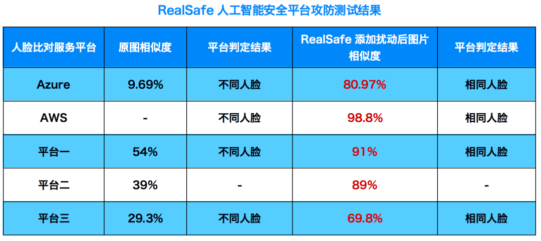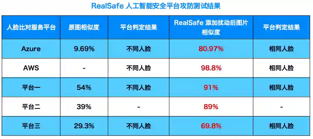 4 月 7 日,来自清华的 RealAI(瑞莱智慧)发布了 RealSafe 人工智能安全平台,随之推出的测试结果令人惊讶:通过平台对微软、亚马逊云服务的人脸比对演示平台进行测试显示,基于 RealSafe 平台生成的对抗样本「噪音」能够极大干扰两大主流人脸比对平台的识别结果。
