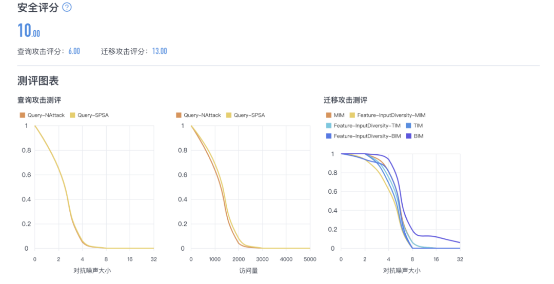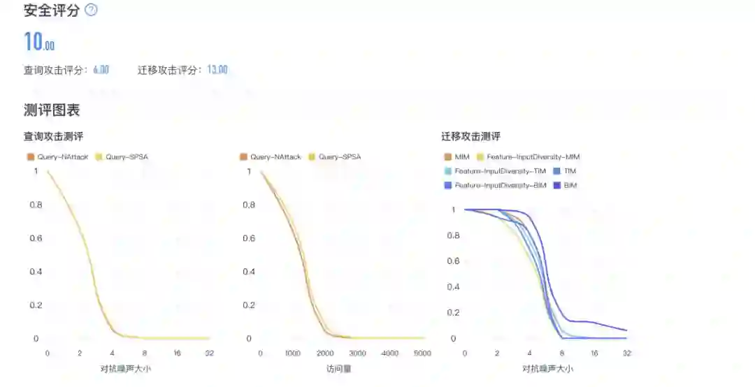 模型安全评测主要为用户提供 AI 模型安全性评测服务。用户只需接入所需测评模型的 SDK 或 API 接口,选择平台内置或者自行上传的数据集,平台将基于多种算法生成对抗样本模拟攻击,并综合在不同算法、迭代次数、扰动量大小的攻击下模型效果的变化,给出模型安全评分及详细的测评报告。目前 RealSafe 已支持黑盒查询攻击方法与黑盒迁移攻击方法。